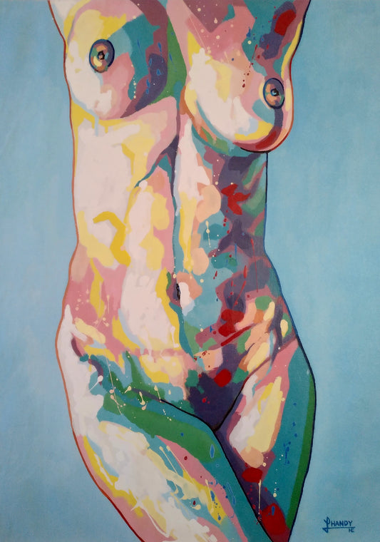 Colors become the center of every painting. Fused to the female figure they become a narrative that stands to make Handy’s figurative artwork his own. It is a study of hidden eroticism and sinuous formative lines that form his composition. His taste for color mixing is impressive, and his choice in color palette is an important part of the creative concept.